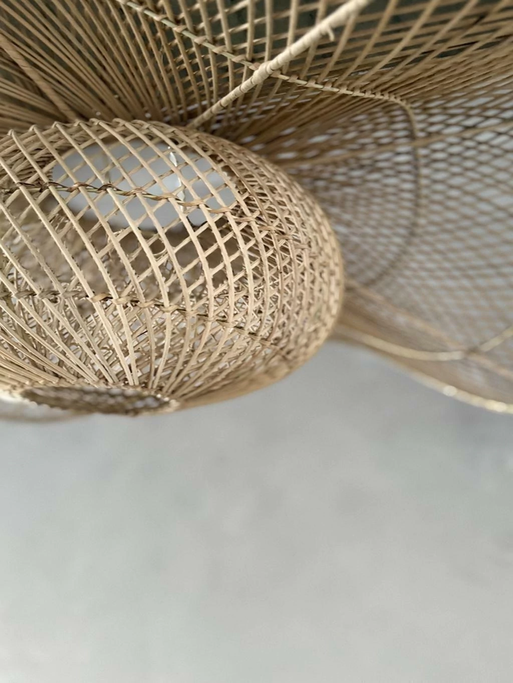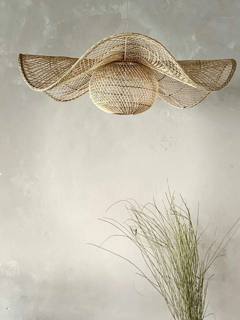 Confeccionada completamente en ratán natural y tejida 100% a mano, su estructura orgánica y fluida remite a las dunas del desierto, proyectando la luz de manera suave y decorativa.