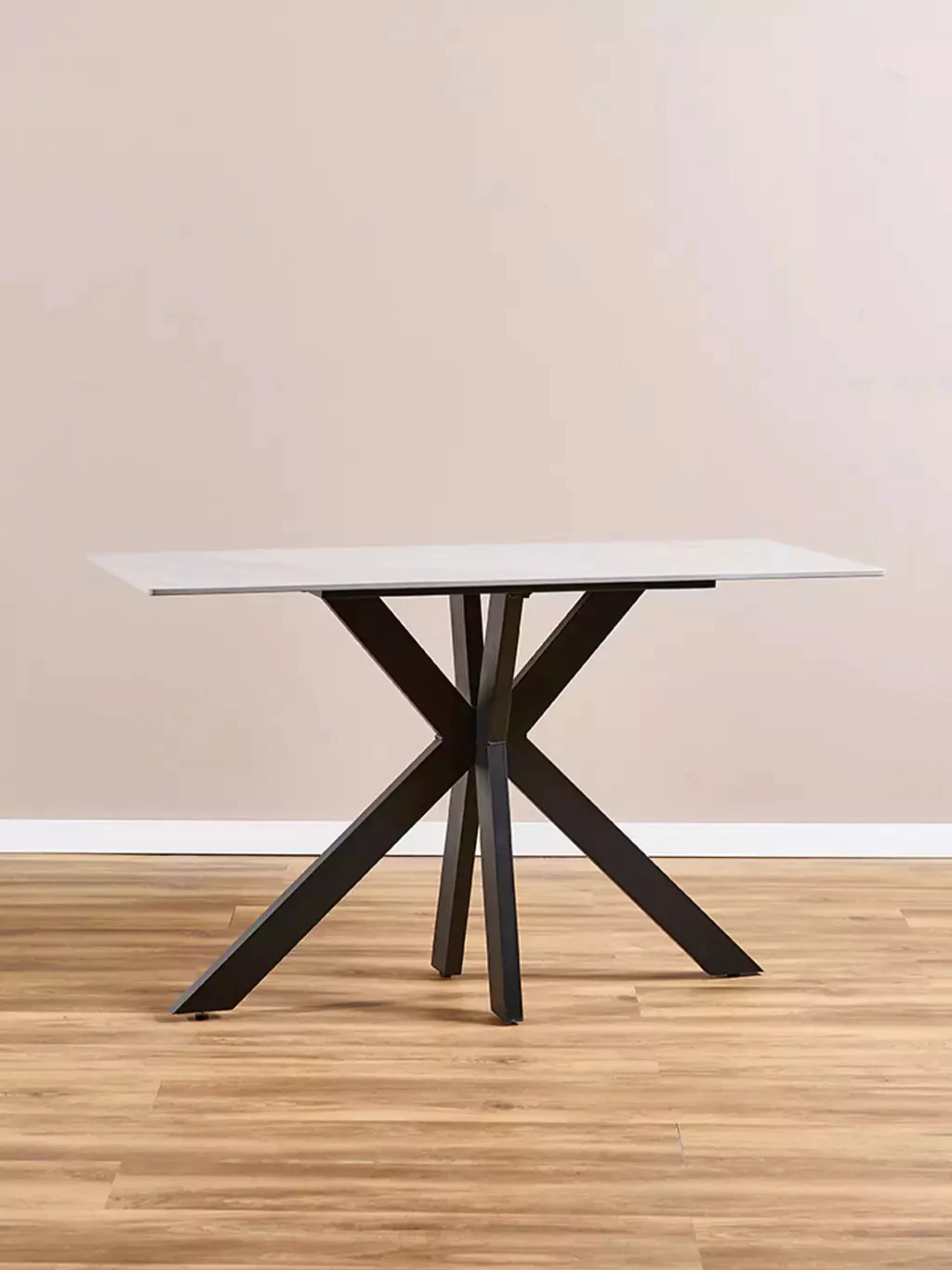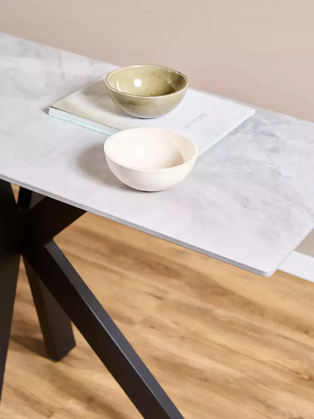 Nuestro recibidor Maya es la pieza perfecta para darle un toque moderno y sofisticado a tu entrada. Con una tapa de porcelanato blanco, aporta un acabado brillante, resistente y fácil de limpiar que le dará un aire de frescura a tu hogar. La base de hierro tipo cruz, pintada en negro mate, combina a la perfección con el diseño minimalista, ofreciendo estabilidad y un toque contemporáneo.
