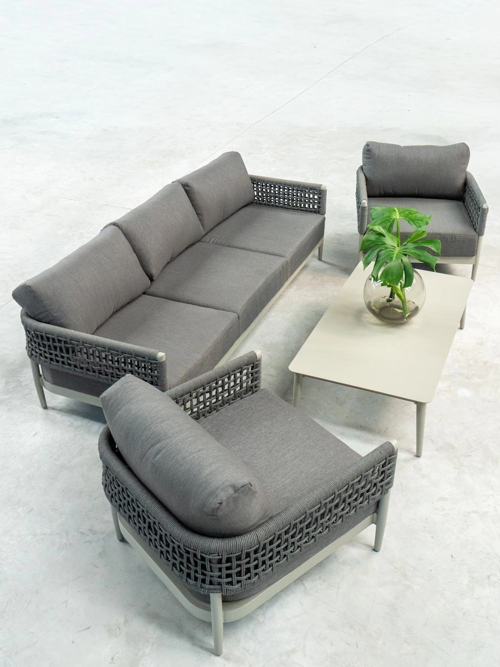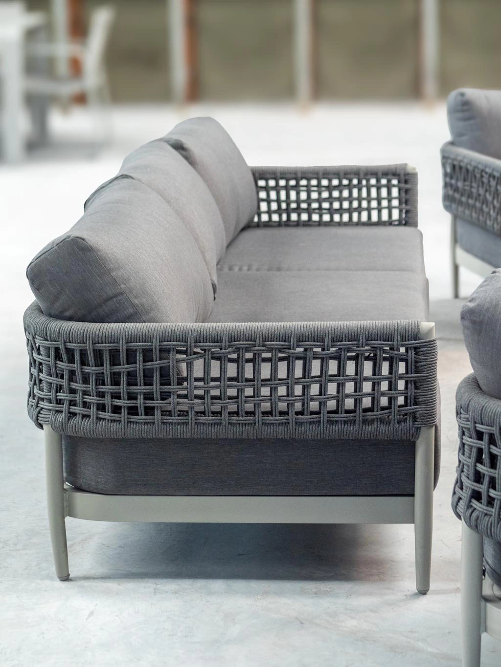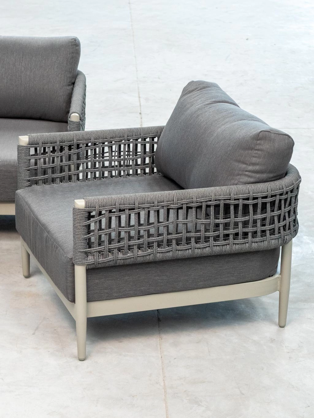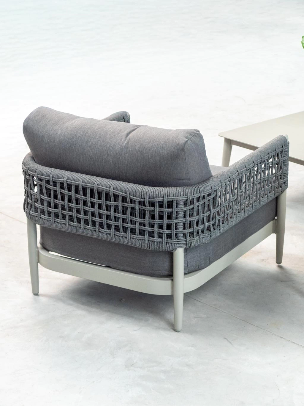 La estructura de aluminio pintada bajo proceso powder coating asegura máxima resistencia al paso del tiempo y un acabado sofisticado que no requiere mantenimiento. El detalle distintivo está en el tejido de cuerdas redondas de poliéster de 8 mm, que envuelven las líneas rectas del diseño y aportan un carácter único, moderno y atemporal.