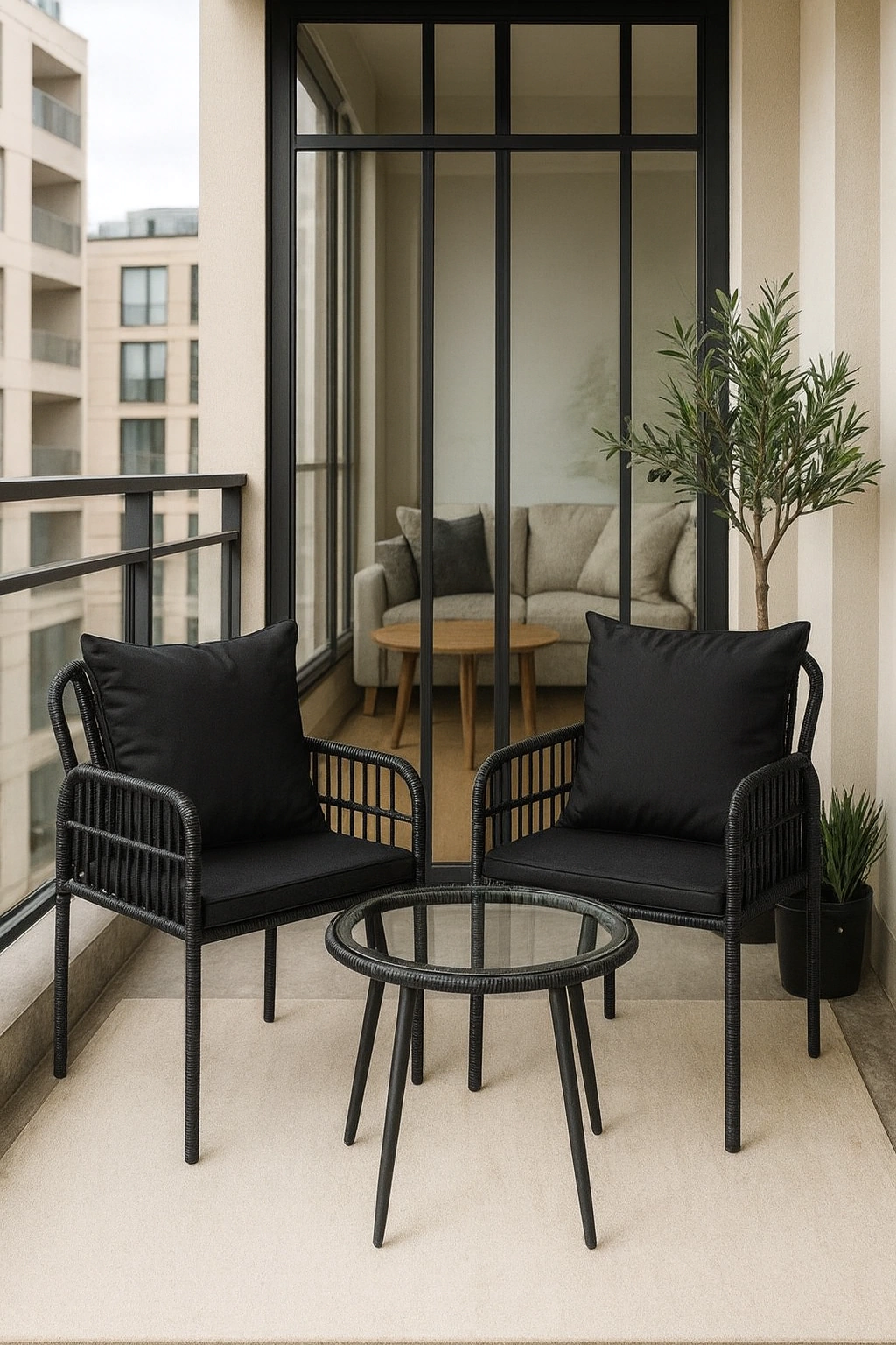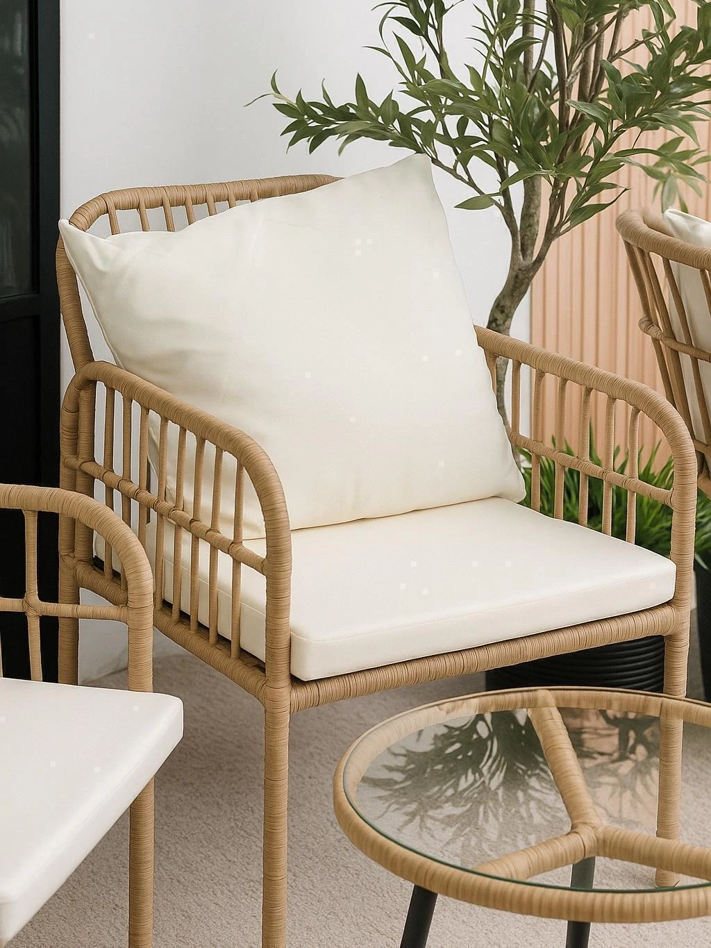 Nuestro set Monet combina la calidez del rattán sintético color natural con la solidez de una estructura de acero negro terminada con pintura powder coating, garantizando máxima durabilidad y un estilo contemporáneo que realza cualquier espacio al aire libre. Su tramado artesanal, realizado en rattán sintético de alta calidad y apto intemperie, resiste sin esfuerzo el agua, el sol y los rayos UV, conservando su textura y tono original a lo largo del tiempo.