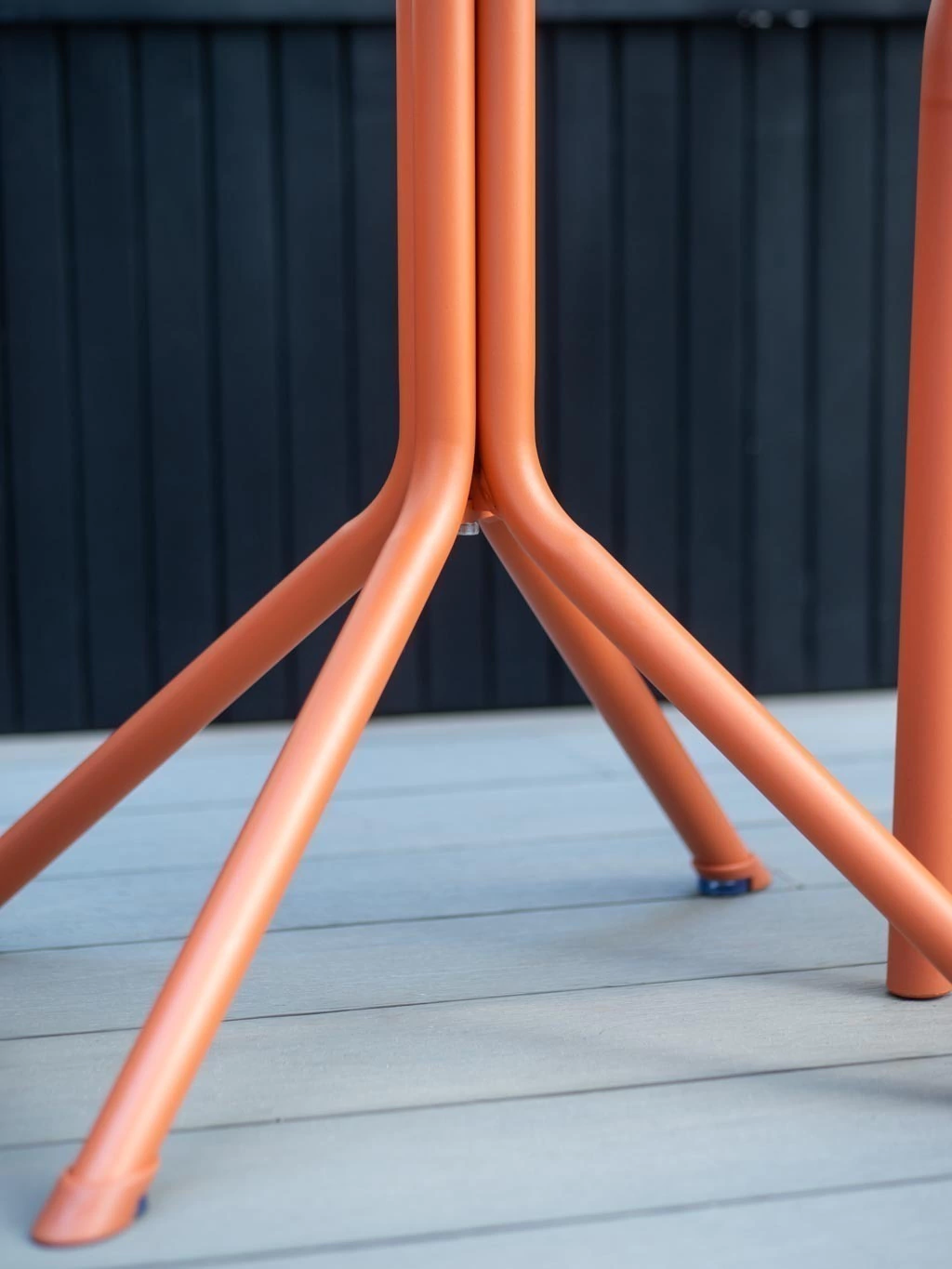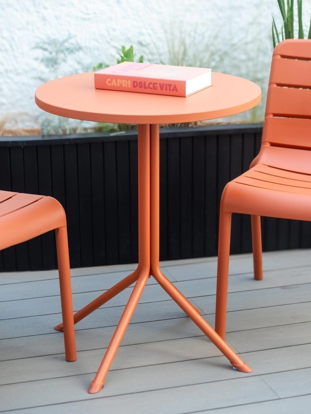 La mesa cuenta con base de aluminio pintado y una tapa de polipropileno inyectado (PP), un plástico rígido de alta resistencia, 100% apto para exterior, que soporta el sol, la humedad y los cambios de temperatura sin deformarse.