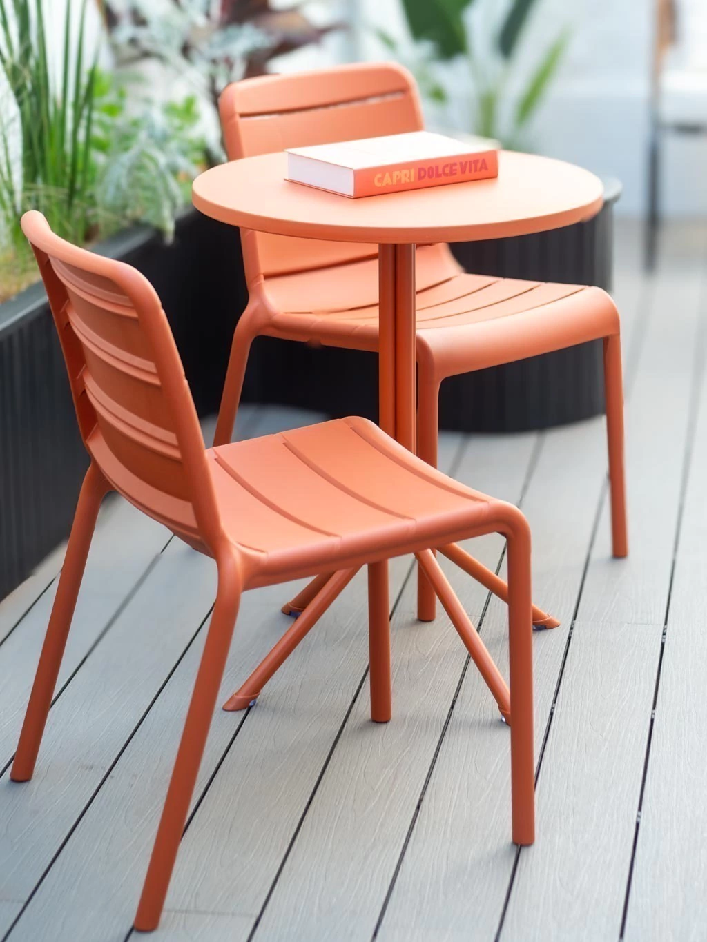 Las sillas están fabricadas en resina de polipropileno reforzado, considerado uno de los plásticos más duros y confiables del mercado para mobiliario de exterior. Esto garantiza larga vida útil, fácil limpieza y cero mantenimiento, sin perder comodidad ni estilo.