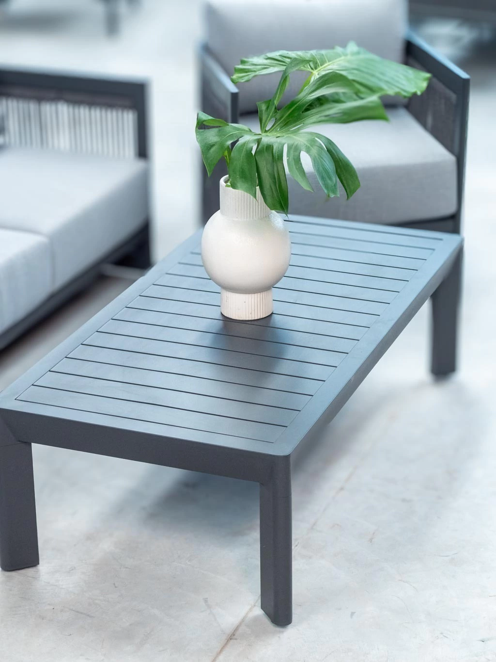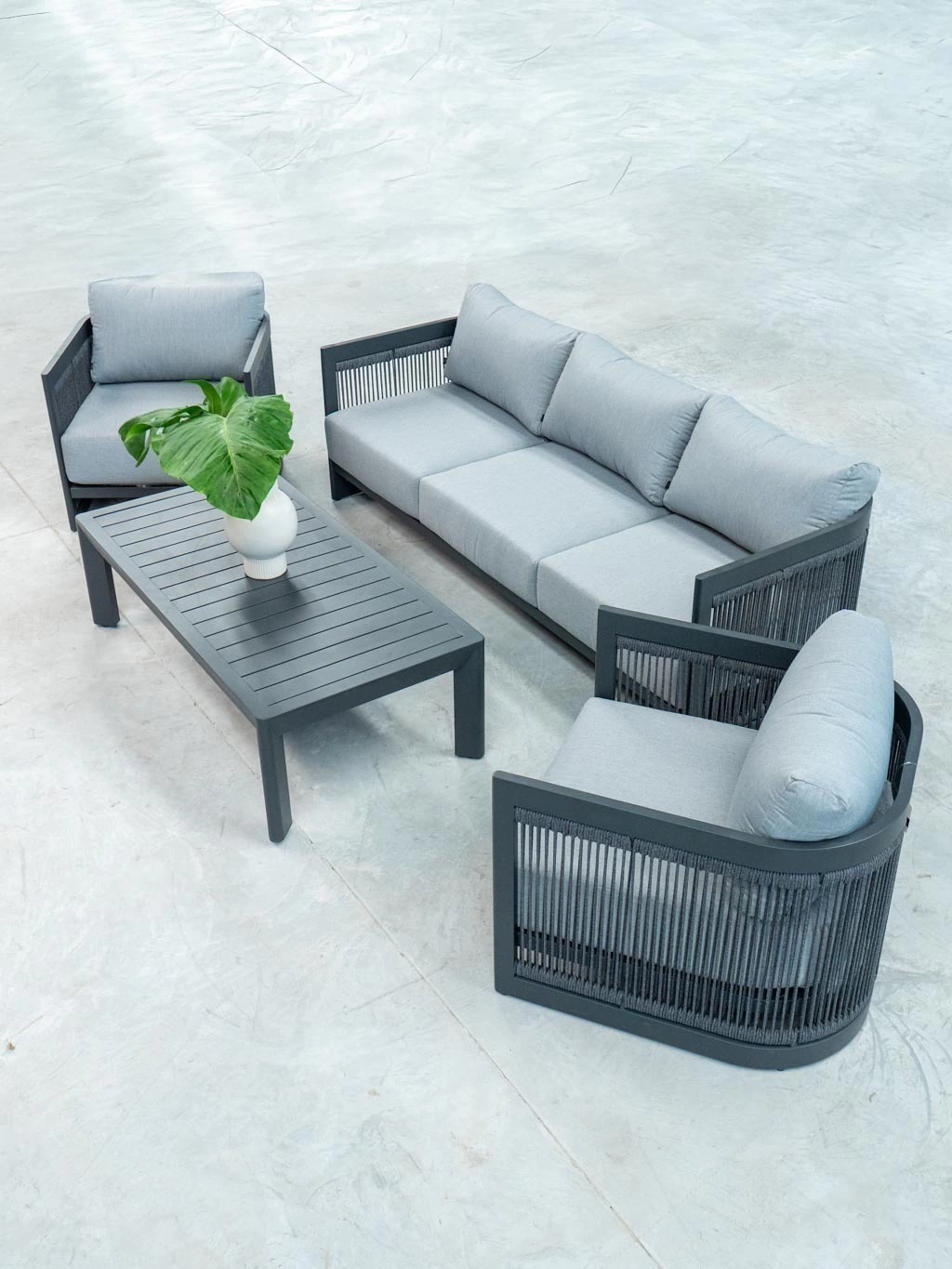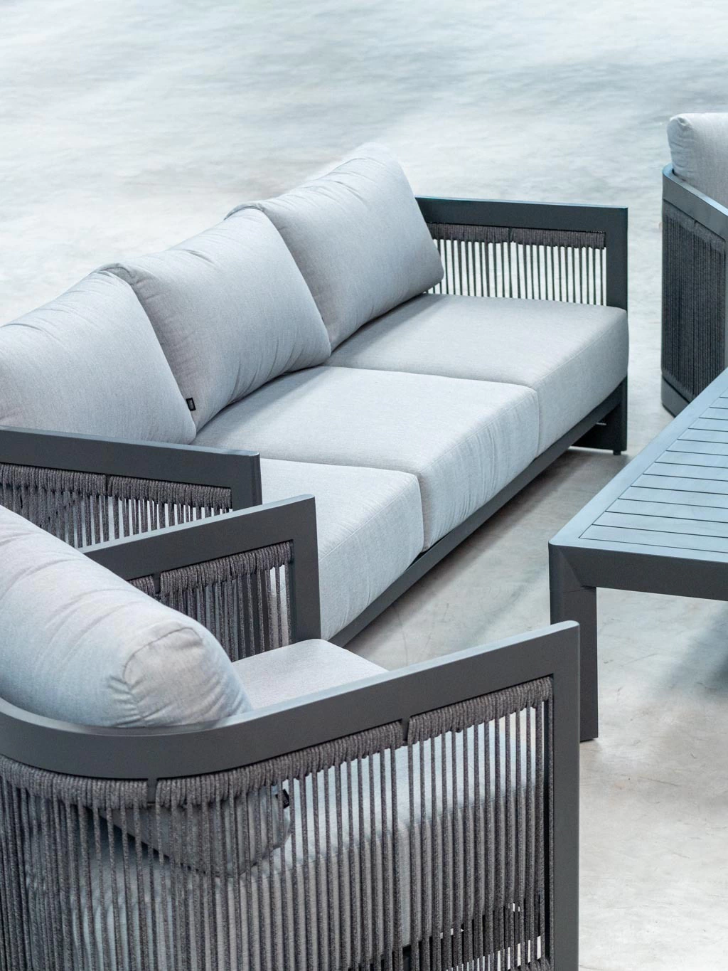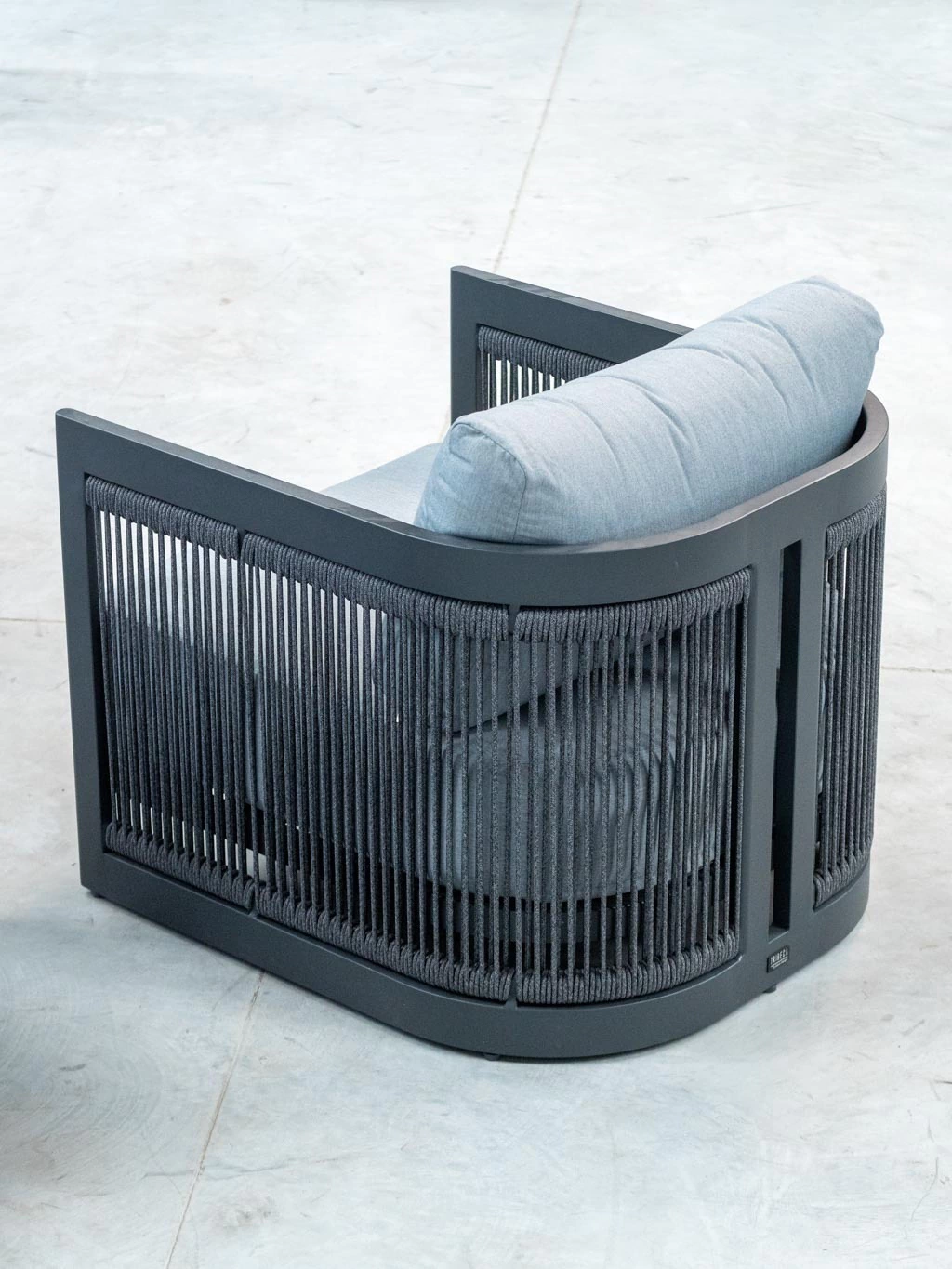 La estructura de aluminio pintada bajo proceso powder coating asegura máxima resistencia y durabilidad, sin necesidad de mantenimiento. Sus líneas curvas, en perfecta armonía con las cuerdas redondas de poliéster de 6 mm, crean un diseño contemporáneo y atemporal, ideal para terrazas, jardines y galerías de estilo premium.
