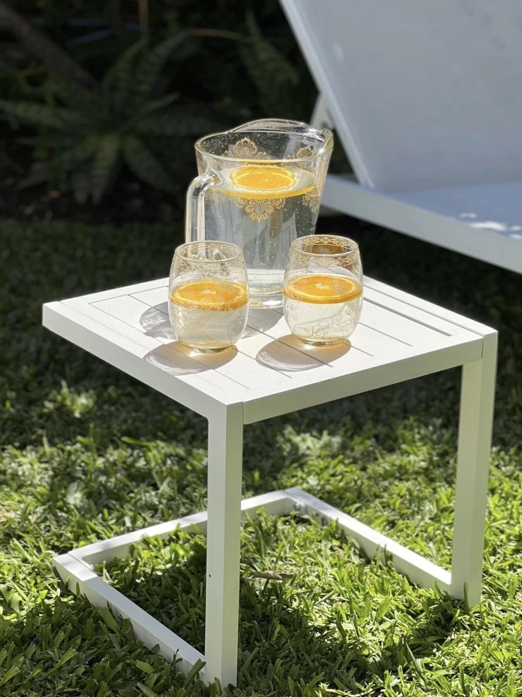 La mesa de arrime, también de aluminio con powder coating, es el complemento perfecto para apoyar bebidas, libros o accesorios, aportando practicidad y estilo al conjunto.