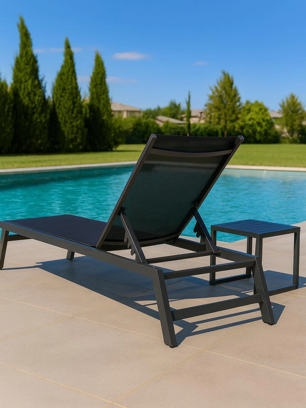 Concebido para quienes buscan diseño y confort al aire libre, este set combina reposeras reclinables con rueditas y una mesa de arrime práctica, en un estilo moderno y atemporal.