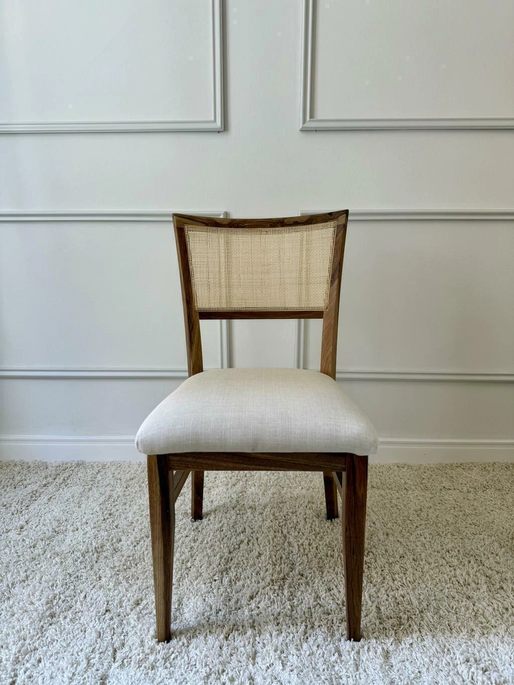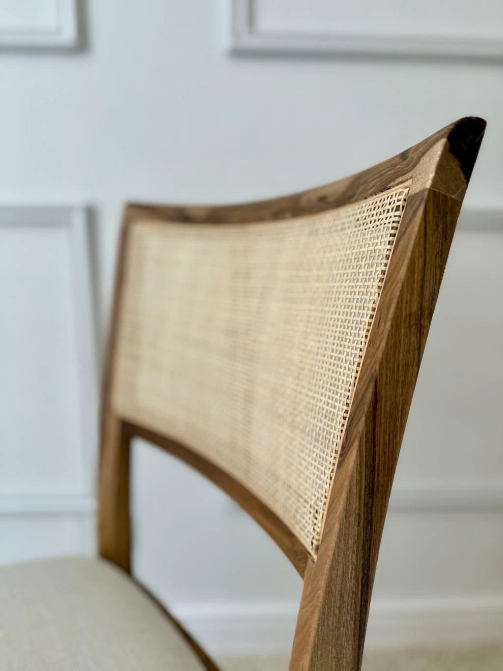 El asiento tapizado en lino, combinado con un relleno de placa de alta densidad (28k) garantiza comodidad excepcional y durabilidad. Su respaldo en fibra natural con esterilla cuadriculada aporta ligereza visual y un toque artesanal que eleva el diseño a otro nivel.